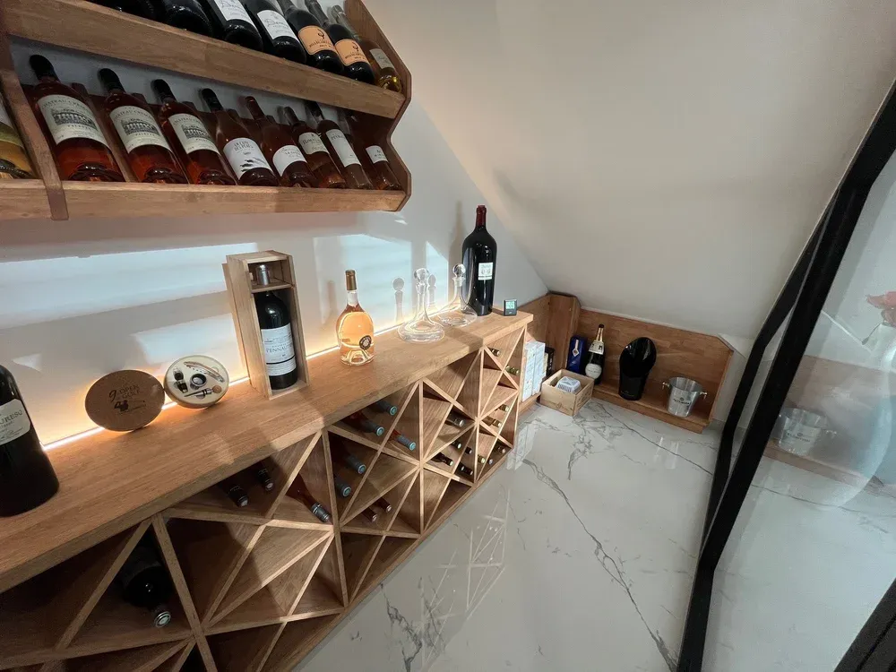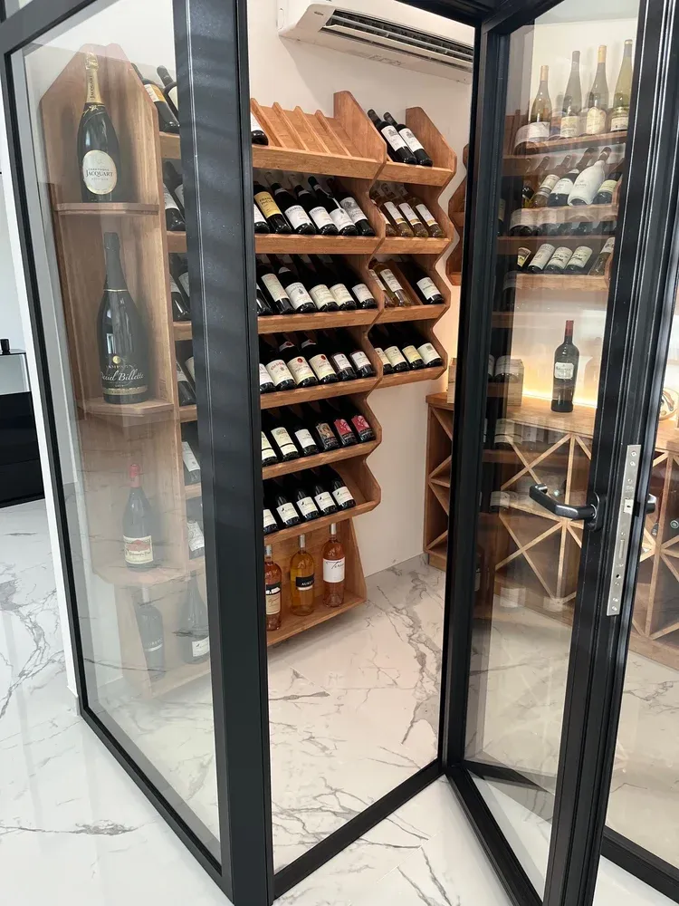 La cave à vin sous escalier réalisée par EDC13 se distingue par l'utilisation de matériaux de haute qualité. Le projet intègre des profils à rupture de pont thermique et du double vitrage, assurant une isolation optimale. Le thermolaquage garantit une finition durable et esthétique, tandis que les meubles sur mesure en bois d'hévéa massif apportent une touche d'élégance et de chaleur. Cette combinaison de matériaux assure non seulement la qualité et la longévité de l'installation, mais aussi une parfaite intégration dans l'espace existant.