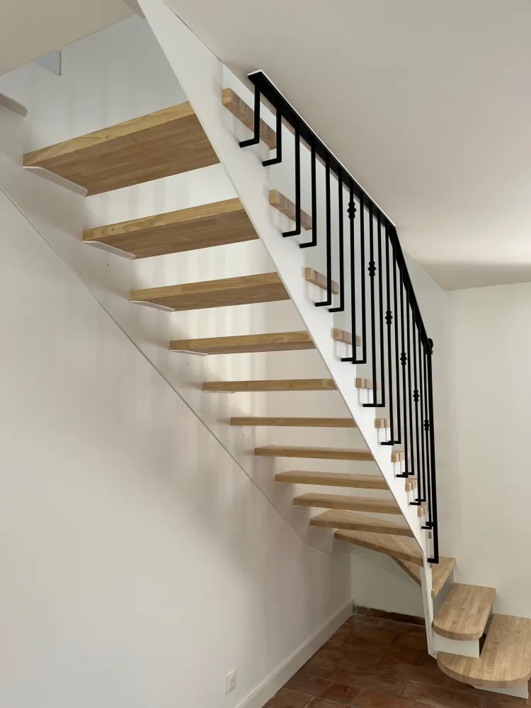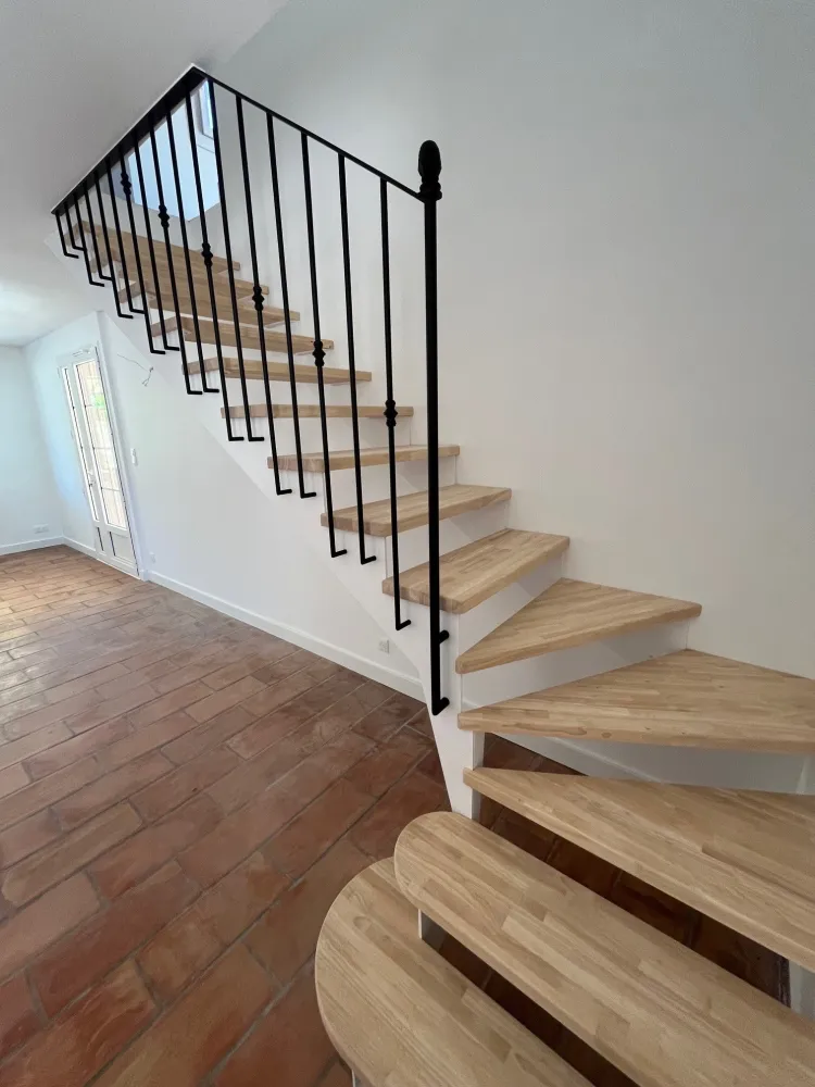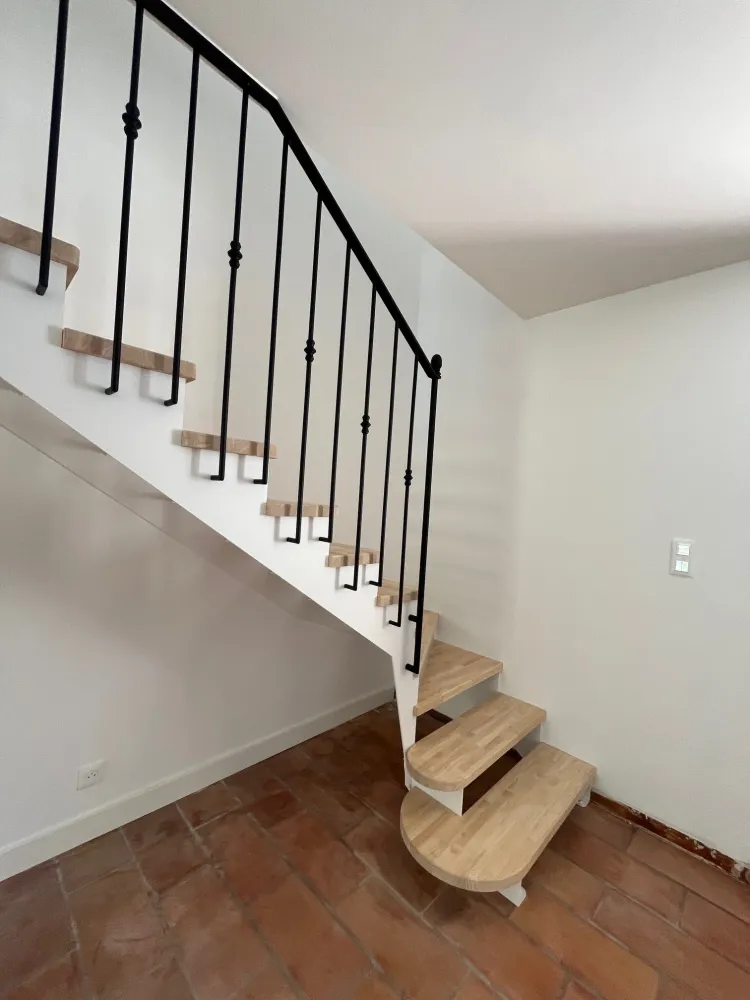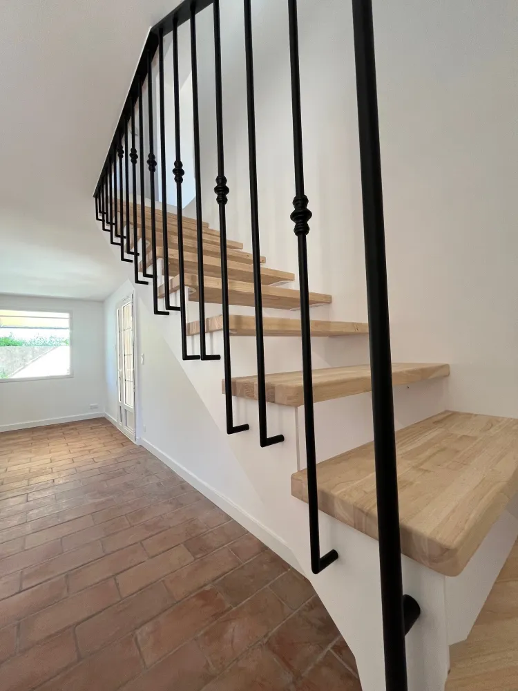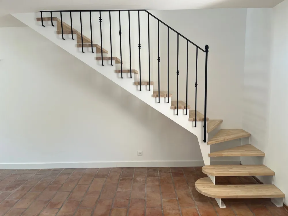 Votre partenaire ferronnier à Aix en Provence, vous dévoile la conception et la réalisation d’un escalier métal/bois inspiré des escaliers béton blanc traditionnel avec garde corps fer forgé.