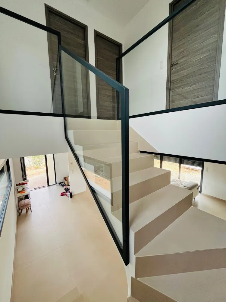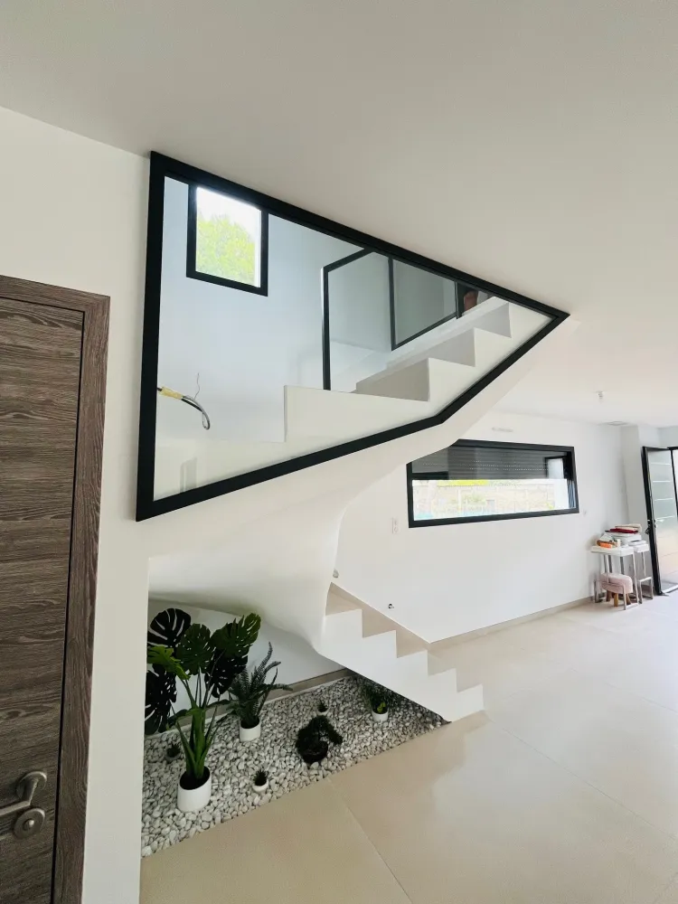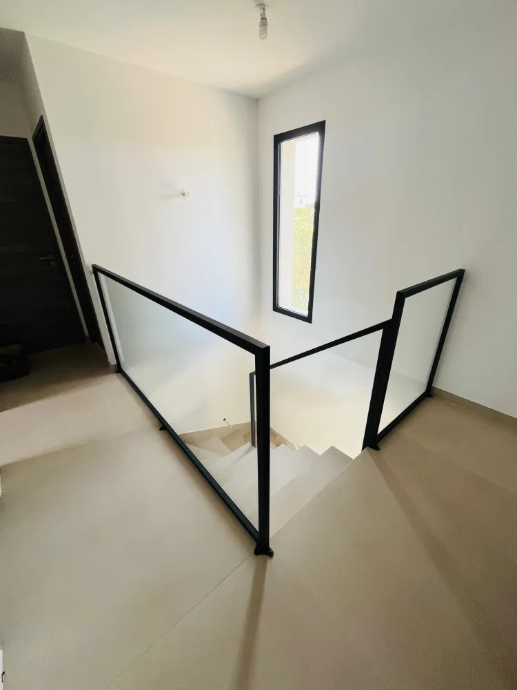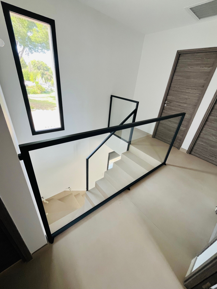 Votre artisan ferronnier à Marseille, vous expose ce garde-corps suite à une demande pour à la fois sécurisé et moderniser cet escalier. la sécurité effectuer grâce à un verre feuilleté 44.2, emprisonné dans un cadre en acier thermolaqué.
